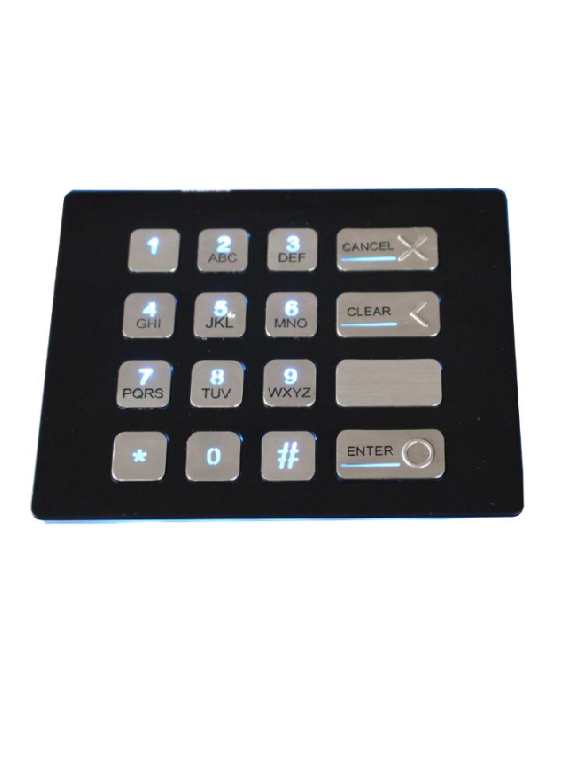 • IP67 static waterproof, 16 Keys • Scratch-proof high quality black titanium electroplated on the top surface • Top panel mount with threaded bolts • Customized layout available • With waterproof gasket • Industrial blue color backlight included